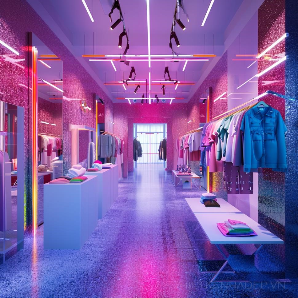 Interior of a clothing store, with garments hanging on hangers, garments folded on white tables, with fuchsia glitter walls, colorful LEDs, blue and fuchsia carpets, mirrors on walls, rendering, cgi, elevated details, in new york , modern style, rendering, cgi, 8k --v 6.0