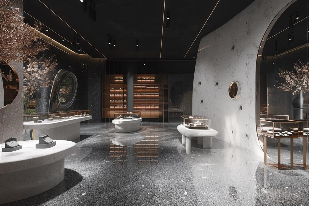 gueitho parkland and giuseppe bordello store design & rendering, in the style of voigtlander nokton 40mm f/1.2 aspherical, cai guo-qiang, dark white and dark gray, gemstone, distinct facial features, hallyu, highly realistic --ar 128:85 --v 6.0