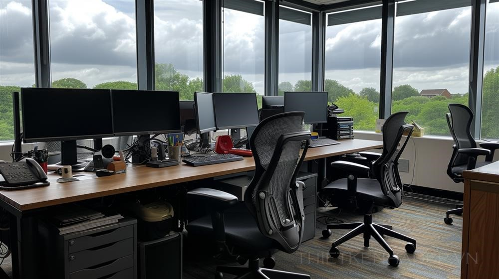 a hotograph of several pre-owned aeron chairs looking like new in a large office with a number of workstations and monitors in view, location high-wycombe-buckinghamshire-weather is dark clouds with raindrops on the windows exterior. --ar 16:9 --v 6.0