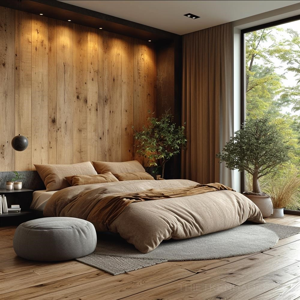 a modern and minimalist bedroom design. The room features a low-profile platform bed with a light-colored bedspread and accent pillows. Above the bed, a wooden panel wall creates a warm, natural backdrop, accented by black metal details that give a clean, geometric look. To the side of the bed, there's a small, round, black bedside table with a contemporary circular lamp that emits a soft glow. The floor is laid with light-colored wood planks, complementing the wooden wall and the gray textured area rug that defines the sleeping area. A round, fabric-covered ottoman sits at the foot of the bed, and a small potted tree adds a touch of greenery, enhancing the room's tranquil and sophisticated atmosphere. The overall color palette is neutral, featuring earth tones that evoke a serene and welcoming environment. --v 6.0 --s 750