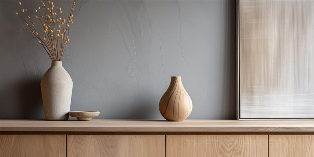 PROMPT: close-up of interior design accessories standing on a wooden cabinet, in the living room against the background of an empty gray wall --v 6.0 --ar 2:1 Ý Nghĩa:
