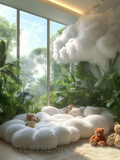 This image is a realistic style photography, bedroom interior design, bed in the shape of a huge cloud, bed is white, upper and lower beds, walls are white, floor-to-ceiling glass windows, carpet, stuffed animals, accent plants, Tropical rainforest outside the window, panoramic photography, sunlight, realistic effect, realistic style, high level of detail, masterpiece, cinematic texture,32k HD --ar 3:4 --s 300 --c 15 --v 6.0 --style raw