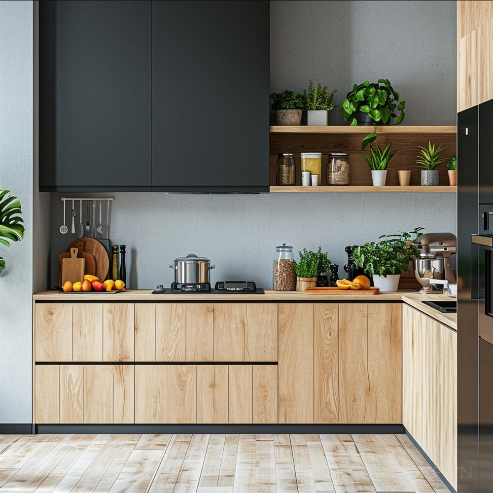 PROMPT: clean composition, front view interior photo image of interior kitchen, wood and black color combination vibe, product photopraphy --v 6.0 Ý Nghĩa: