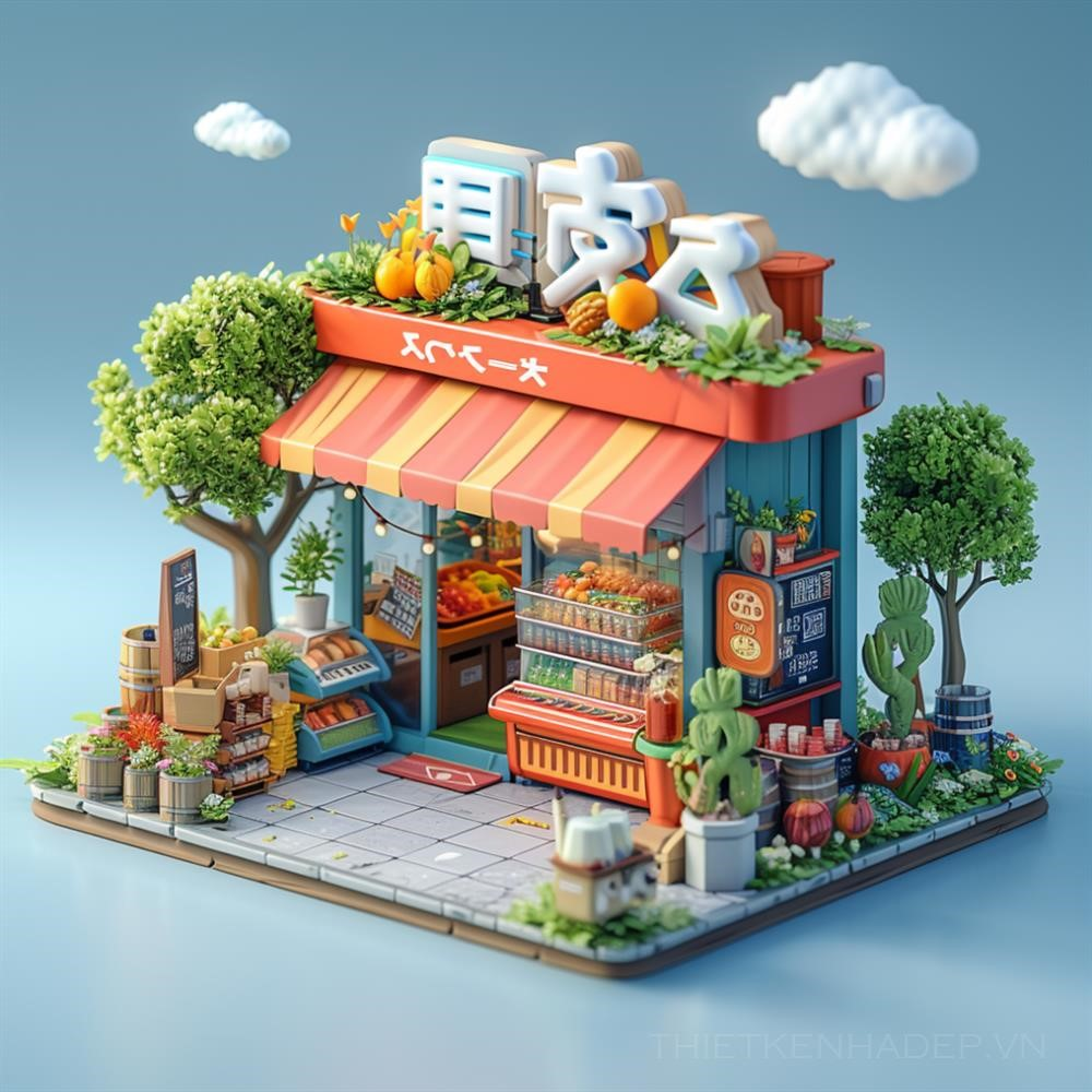 PROMPT: 3d rendered model of store, in the style of graphic design-inspired illustrations, cyclorama, bright sculptures, tilt shift, website, polaroidcore, 2d game art, isometric, rainbowcore --s 250 --v 6.0 Ý Nghĩa: