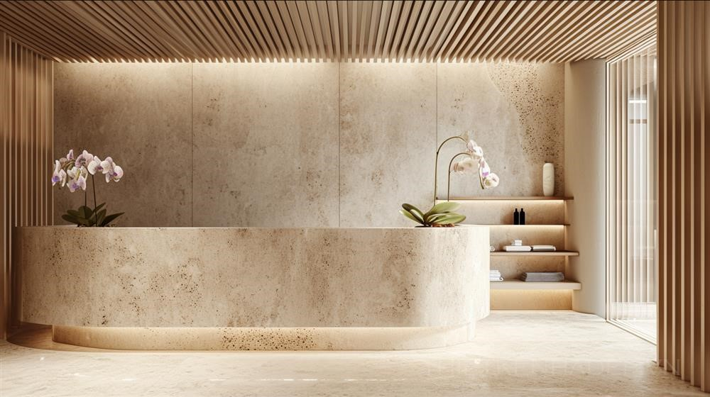 PROMPT: long shot of luxury minimal beauty salon, light mineral stone wall , oval reception bar with wooden strips. an orchid flower on the top --ar 16:9 --v 6.0 Ý Nghĩa: