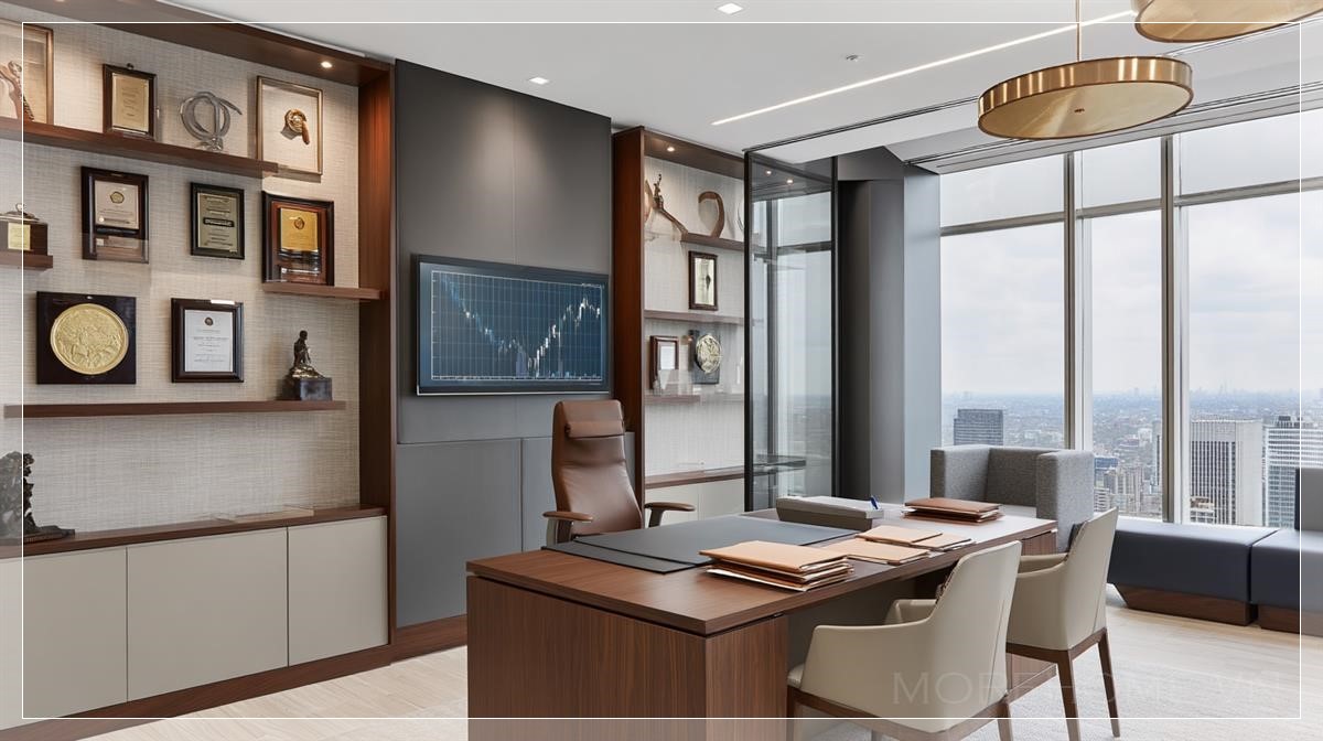 Phía xa, trên bức tường lớn, một màn hình phẳng khổng lồ đang cập nhật biểu đồ chứng khoán, đưa không gian văn phòng vào nhịp sống của thị trường tài chính sôi động. Mọi thứ trong căn phòng này đều được thiết kế để phục vụ cho công việc với tối đa hiệu quả nhưng vẫn giữ được vẻ đẹp tinh tế và sang trọng. Những đường nét gỗ nâu ấm áp của bàn làm việc kết hợp hài hòa với các yếu tố hiện đại của không gian xung quanh, tạo nên một không gian làm việc đầy cảm hứng và không kém phần trang trọng.