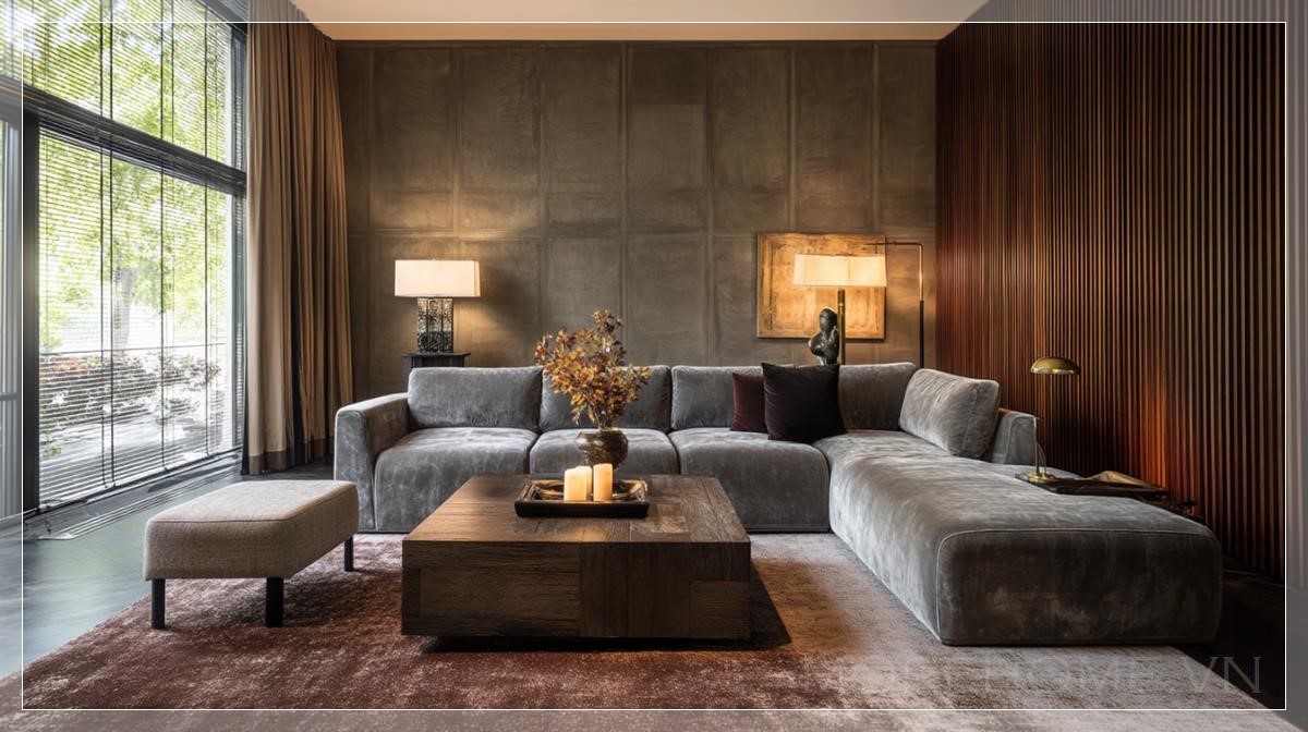 The camera is pointed at the front of the sofa. In this modern interior design photo, a modern grey velvet three-seat straight sofa is placed in the center of the living room, and there is also a footstool beside it. Architectural Digest Photography. Warm coffee-colored walls and soft brown carpets. This house is located as a vacation villa in an upscale and wealthy community in Los Angeles. The natural lighting in dark tones, the interior architectural magazine aesthetics, and the rich colors fully demonstrate the owner's taste and attitude towards life. 4k high-definition pixels, rich in details. Shot with a telephoto lens. --ar 16:9 --v 7.0 --iw 3