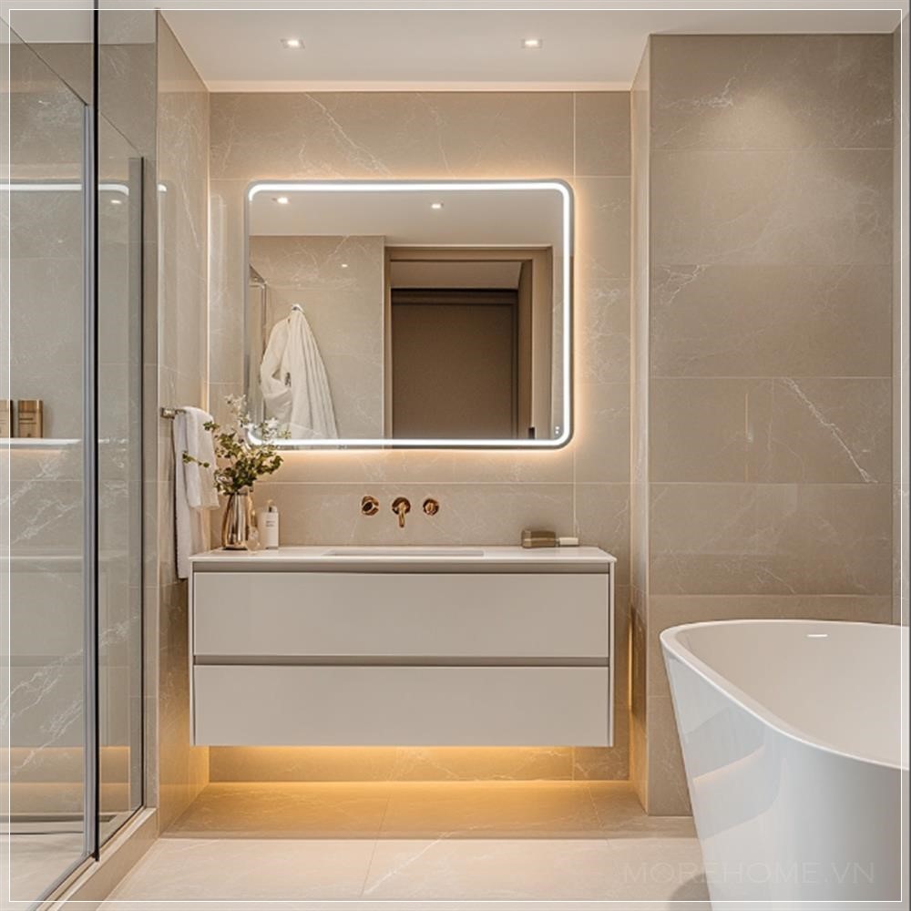 Với những đặc điểm nổi bật này, thiết kế phòng tắm hiện đại với tủ lavabo và gương LED không chỉ đáp ứng được yêu cầu về công năng mà còn giúp không gian trở nên sang trọng và cuốn hút hơn. Đây là lựa chọn lý tưởng cho những ai yêu thích sự tinh tế, hiện đại nhưng không kém phần ấm cúng. Khi kết hợp với bồn tắm nằm cạnh đó, không gian sẽ trở thành một nơi thư giãn lý tưởng, giúp xóa tan mọi căng thẳng sau một ngày dài. Phòng tắm không còn chỉ là nơi vệ sinh mà còn là một không gian nghỉ ngơi, thư giãn đầy tiện nghi.