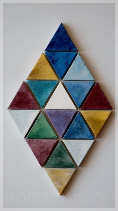 Thiết kế này sử dụng những hình tam giác đều, được xếp chặt chẽ trên nền vải canvas, tạo nên một bố cục mạch lạc nhưng không thiếu sự phóng khoáng. Mỗi mảnh ghép như một phần của một bức tranh lớn, nhưng cũng có thể tách biệt để trở thành những tác phẩm độc lập. Các mảnh tam giác với góc cạnh sắc nét không chỉ tạo nên một cảm giác chặt chẽ mà còn mang lại sự sống động cho bức tranh, đặc biệt khi ánh sáng chiếu vào sẽ làm nổi bật các góc cạnh, tạo ra hiệu ứng chuyển động thú vị.