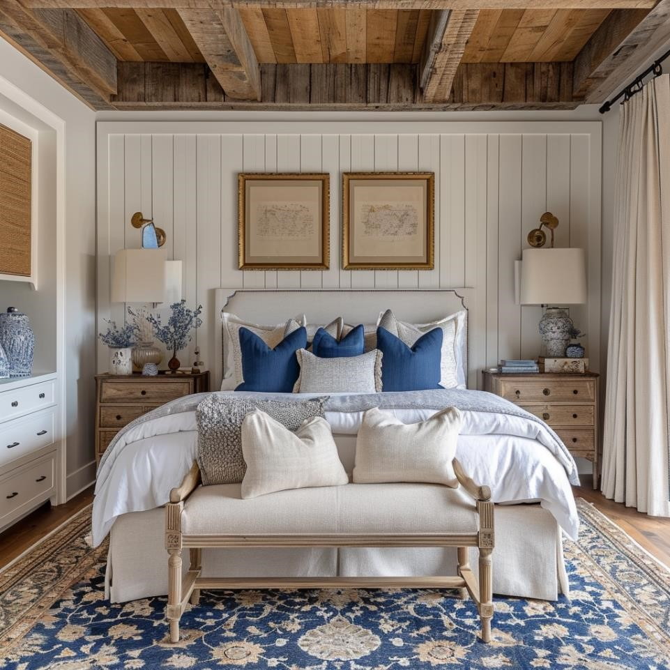 Contemporary interior design image of Luxury master bedroom:: midnight blue walls, cream king size bed:: layered with blankets and throws:: gray and white pillows:: studio mcgee style wall art above the bed:: double windows with curtains:: ar 16:9 --style raw --stylize 250 --v 6.0