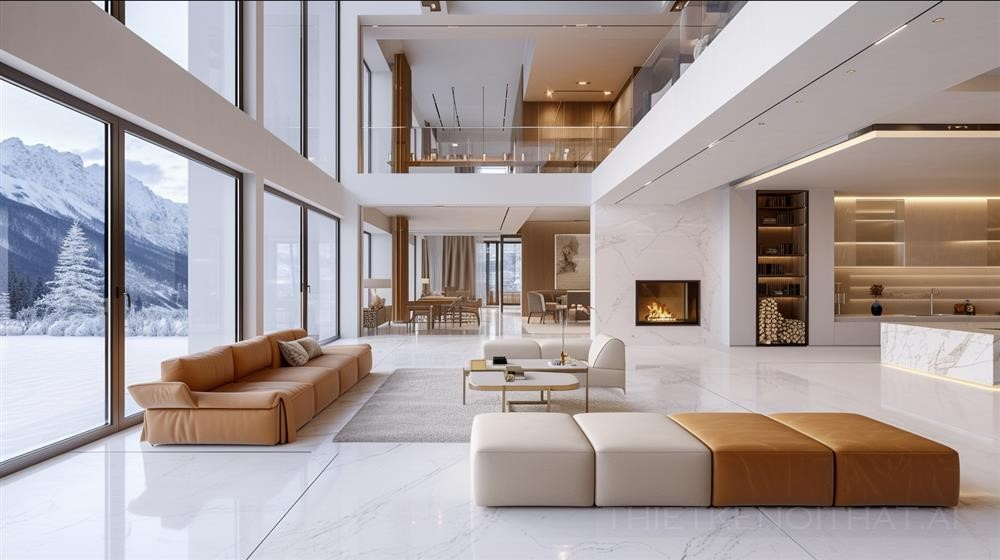 Commercial photography, real shooting, a wide luxurious living room with just one small fireplace, fireplace located at the far end of the photo, featuring big frameless floor-to-ceiling windows at the right side of the photo, living room mainly with white marble, facing the mountains, including a study and a dining room, have a second floor, realistic details, with light colored genuine leather sofas having clear textures, richly furnished for a very warm atmosphere. Designed in 32k ultra HD, high-definition photography, snow scenes, multilayered, depth view, natural wonders, cabin core, and realistic style, masterworks --ar 121:68 --no sunshine, snow in the room, fire on the table, fire in the fireplace --v 6.0