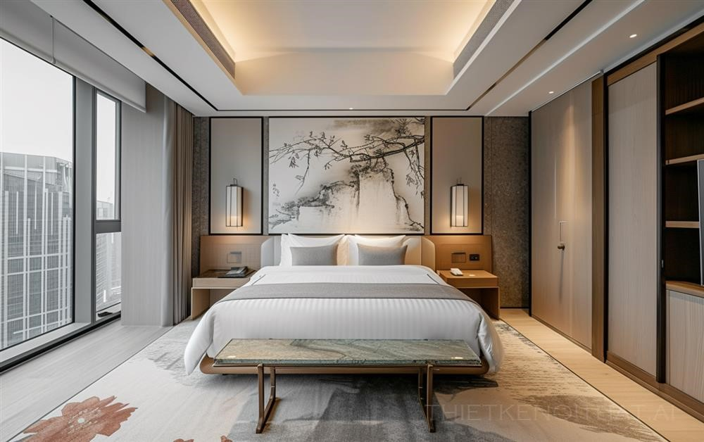 PROMPT: Andaz Hotel Presidential Suite Bedroom, designed by CCD Zheng, modern minimalist style, yayoikusama decorative painting, branded furniture, grey wood, light wallpaper, metal, jade table, real photo --ar 8:5 --v 6.0 Ý Nghĩa: