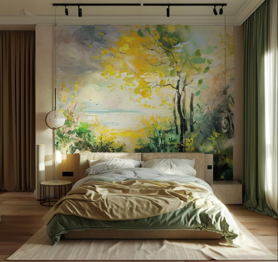 PROMPT: green bedroom for a modern home, in the style of mural-like compositions, light beige, dreamlike scenery, decorative paintings, luminous quality, yellow and green, large canvas format, neatly made bed --ar 125:117 --v 6.0 Ý Nghĩa: