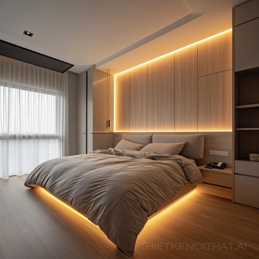 PROMPT: bedroom interior design. 3000K LED light strips behind the bedside lean-to and on the ceiling produce a noticeable warm White light effect. Minimalist style. --style raw --v 6.0 Ý Nghĩa: