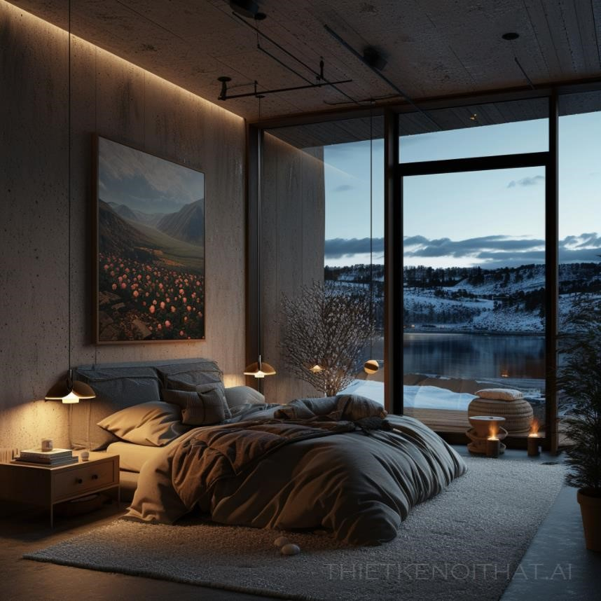 PROMPT: Bedroom, large floor-to-ceiling windows, soft lighting, night, roses, clean ceiling, a painting hanging on the wall, Nordic style, night, romantic atmosphere --v 6.0 Ý Nghĩa: