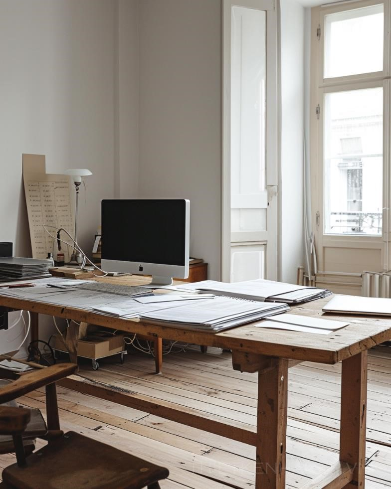 PROMPT: light wood table with documents, measurements, computer in minimalistic interior, in balenciaga style 35mm CineStill 50D--c 10 --style raw --ar 4:5 --v 6.0 Ý Nghĩa: