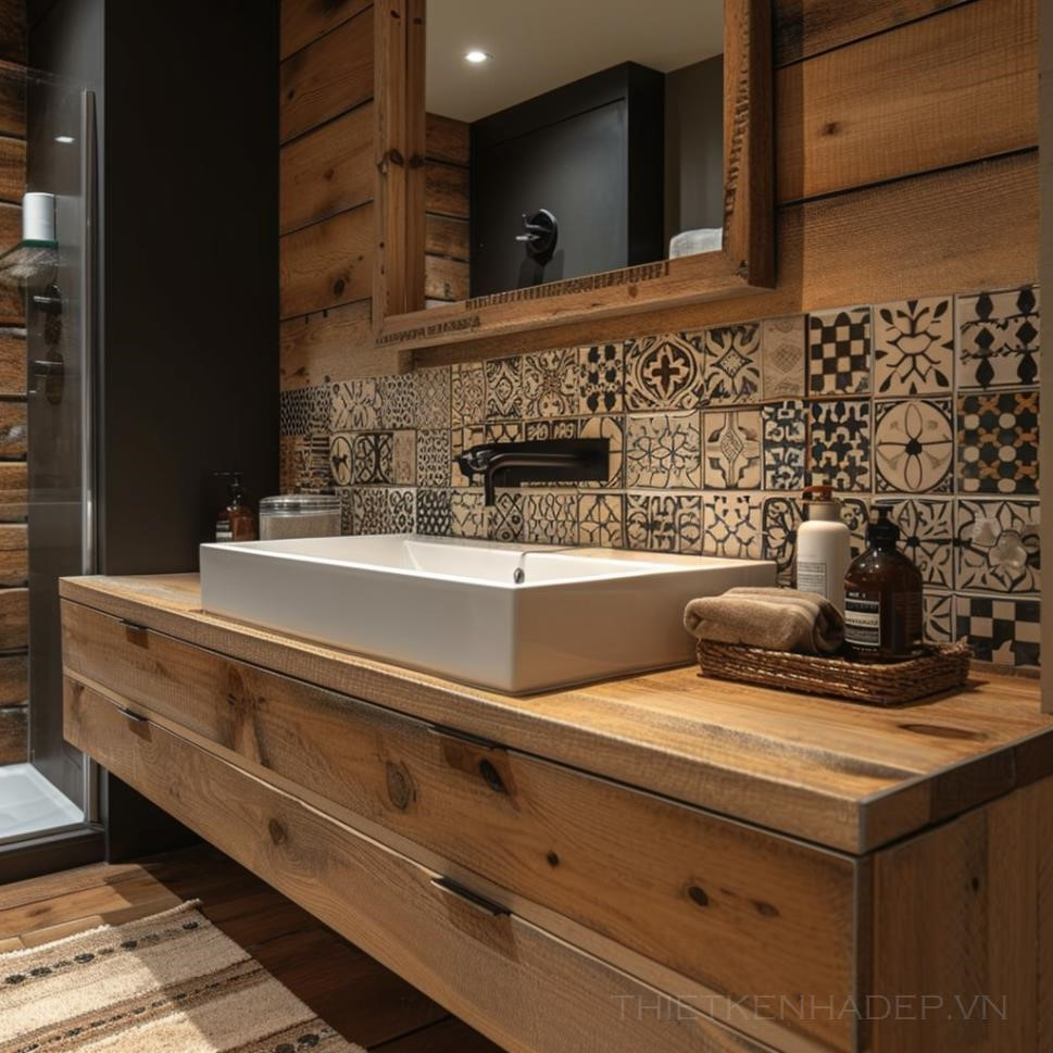 PROMPT: 2024 trends, bathroom design, small detail tiles, wood tones, black contrast, showers, mixed material, one accent wall --s 750 --v 6.0 --style raw Ý Nghĩa: