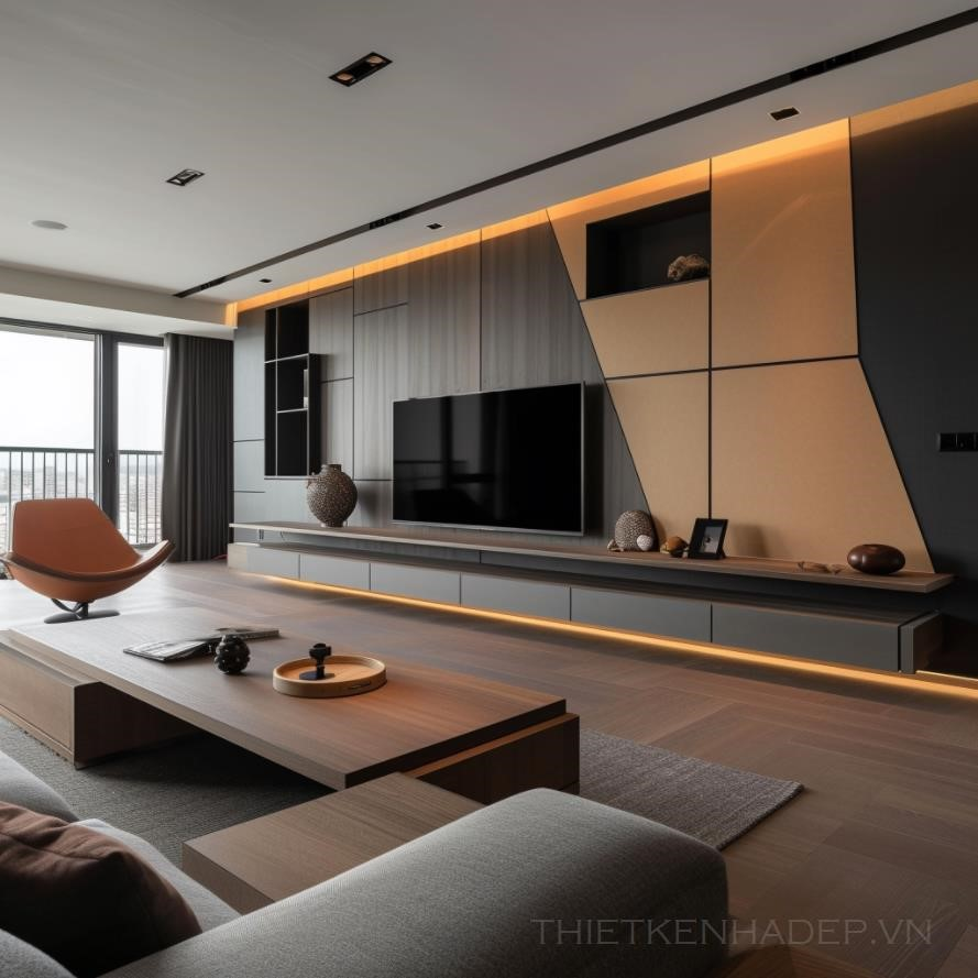 PROMPT: modern apartment living room with a long tv console that extends out into the centre of the room --v 6.0 Ý Nghĩa: