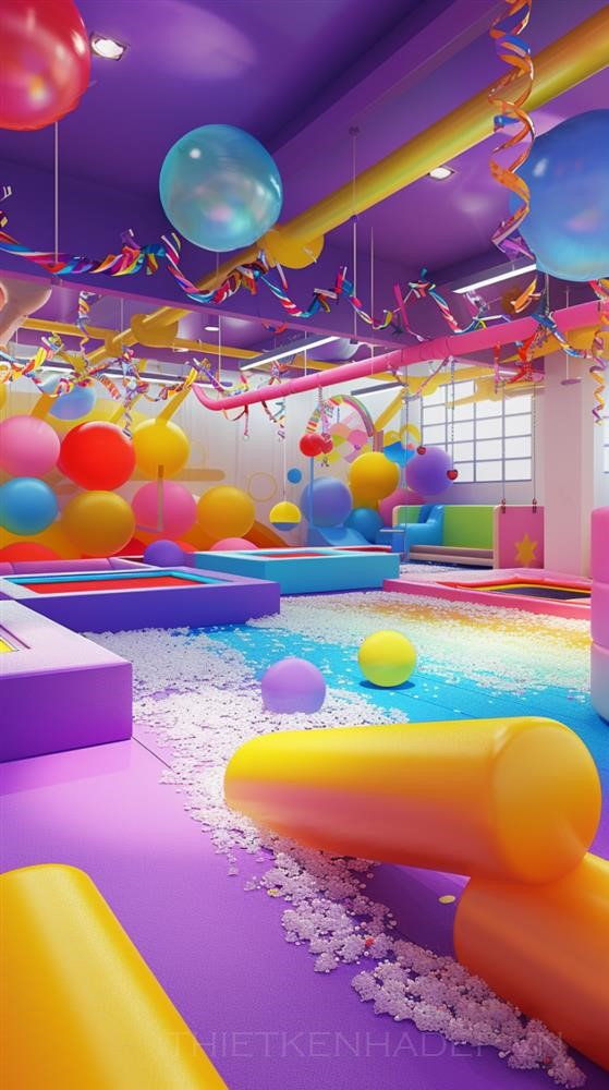 Poster style, A vibrant and colorful acrobatics-gym space designed for kids, featuring playful equipment like foam pits, balance beams, and trampolines. The atmosphere should be inviting and fun, filled with bright colors and soft, safe play areas. The setting should convey a sense of joy and excitement, suitable for a children's birthday party, with decorations like balloons and streamers subtly included to enhance the festive vibe. The overall image should appeal to children aged 3 to 4 years, capturing the imagination and promising an unforgettable adventure. --ar 9:16 --no people, families, kids, adults --v 6.0