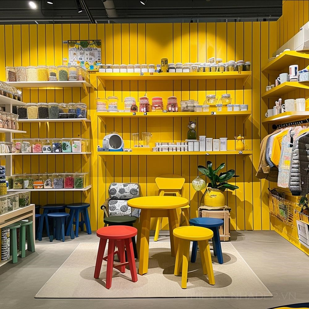 PROMPT: a fully yellow and colorful corner in an ikea shop, the corner sells tea time kits and accessories, little tables and chairs, the corner sticks out with its vibrant colors --v 6.0 Ý Nghĩa: