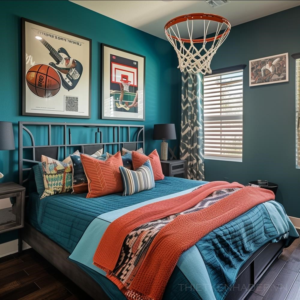 PROMPT: kids bedroom, sports theme, posters, basketball hoop, teal --s 50 --v 6.0 Ý Nghĩa: